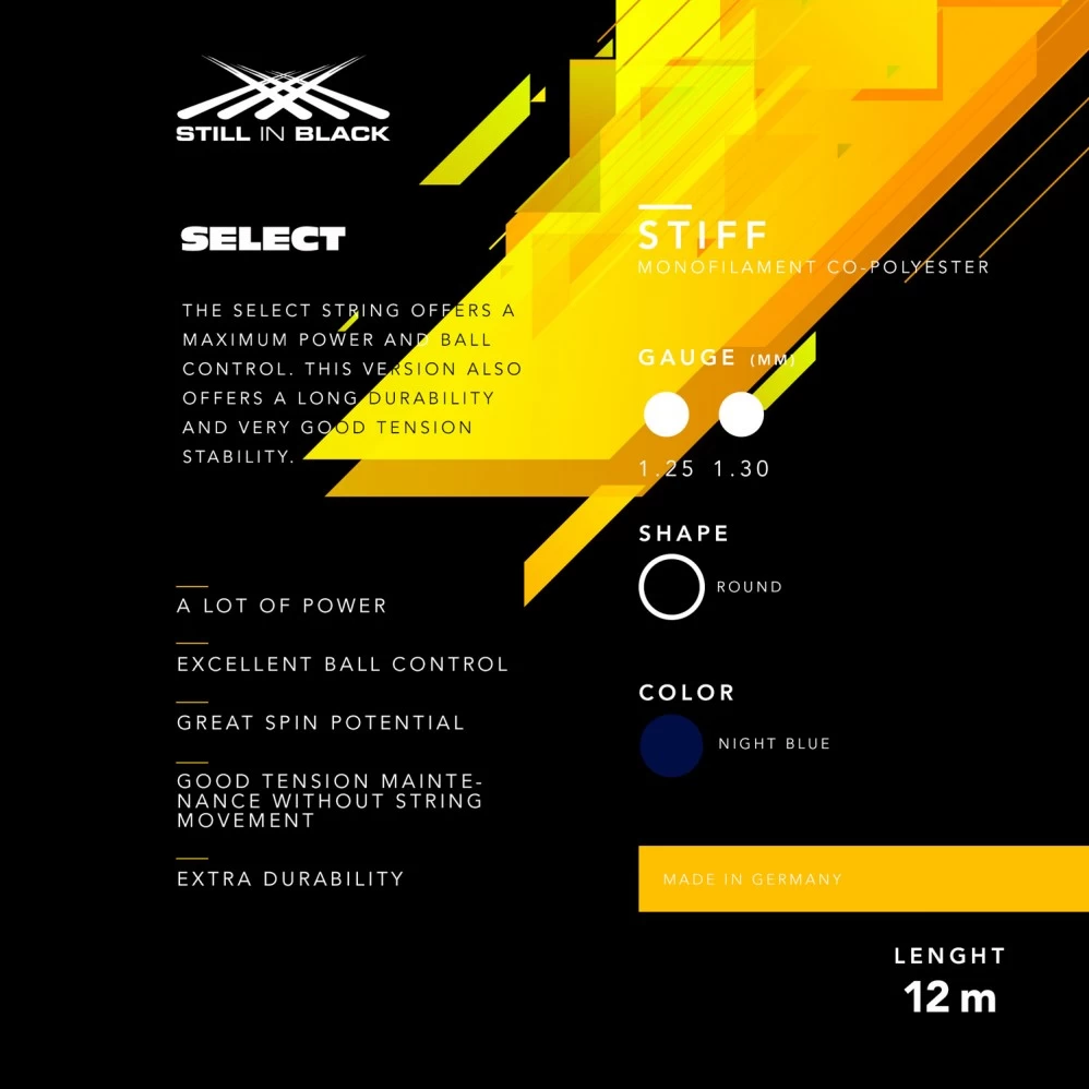 Le cordage Still In Black Select offre un excellent contrĂŽle de balle et feeling lors de la frappe. La prise d’effet est excellente.